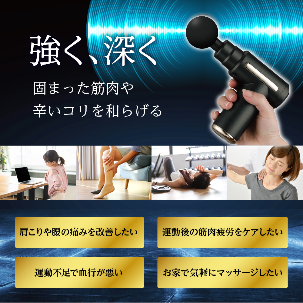 毎分最大3,300回の振動と振幅6mmが生み出すパワフル振動! 6段階の振動レベルで気になる箇所をピンポイントで奥深く刺激します。 女性でも片手で使用できる軽さ、わずか475g。(アタッチメント除く) アタッチメントは4種類あり、身体のあらゆる部位にフィットします。 USB充電で、どこでも気軽に充電できるのでオフィスの休憩時間に・・ 旅行の移動時間に・・シーンを選ばず、お使いいただけます。